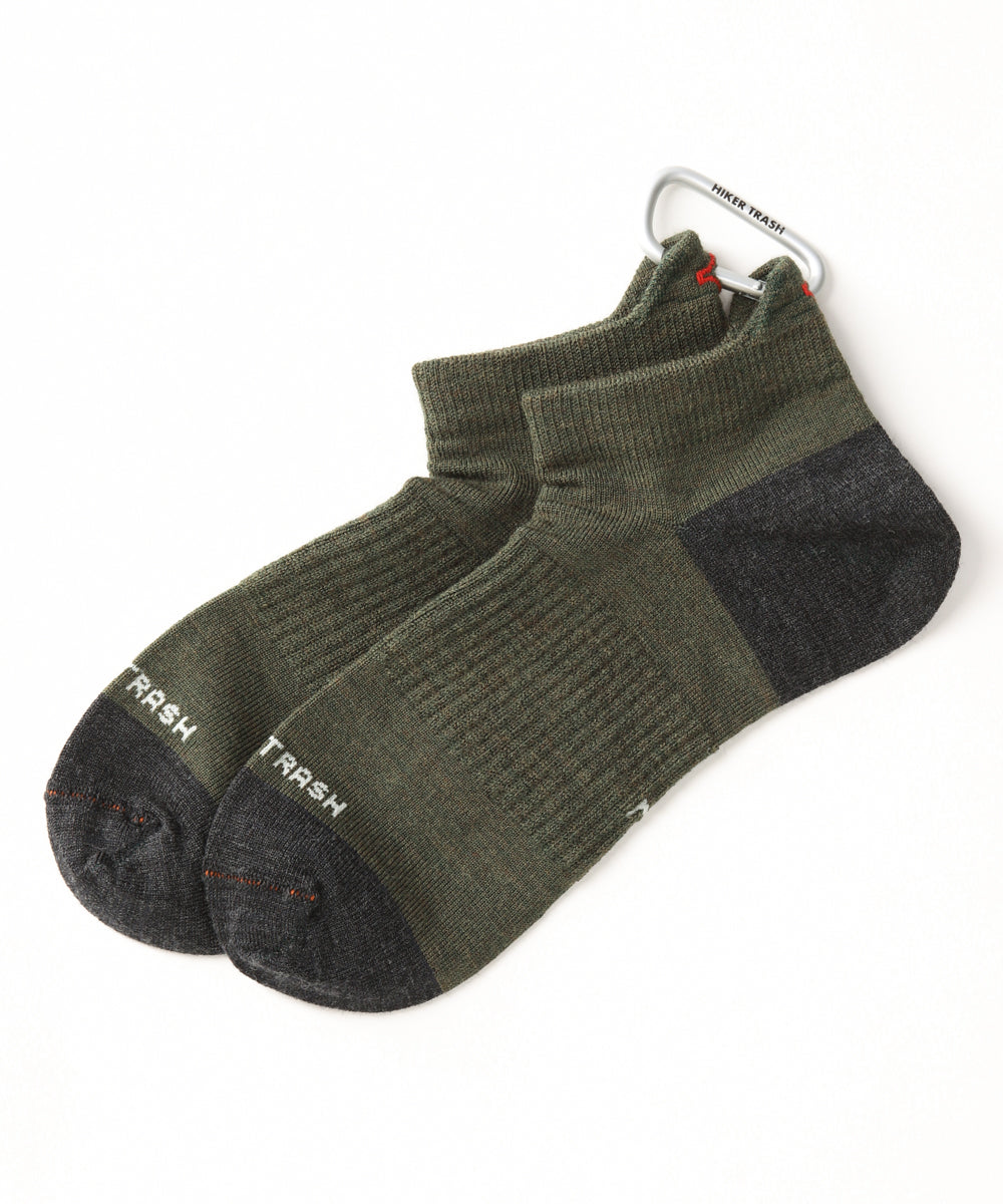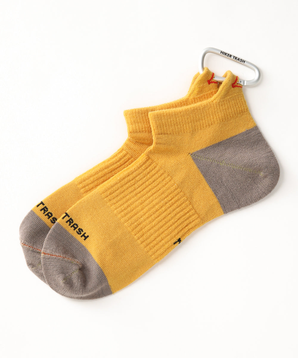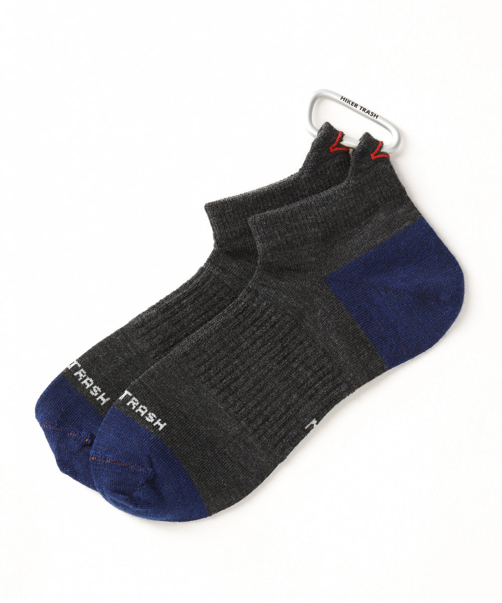 HIKER TRASHのソックスの履き口にはカラビナを通すためのホールが設けられている。これはロング・ディスタンス・ハイカーたちが濡れたソックスを乾かすためにナイフで穴をあけてテントやバックパックに吊るす様子から着想を得た。乾いたソックスはいつでもハイカーたちを幸せにする!